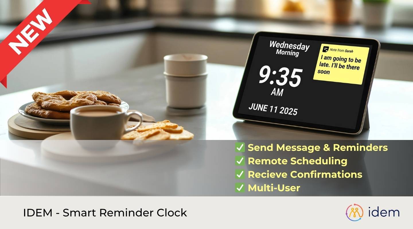 Talking reminder clock with remote calendar scheduling to help people maintain an independent lifestyle. The day’s schedule can be shown on the screen and family members or caregivers can help keep the calendar up-to-date remotely.